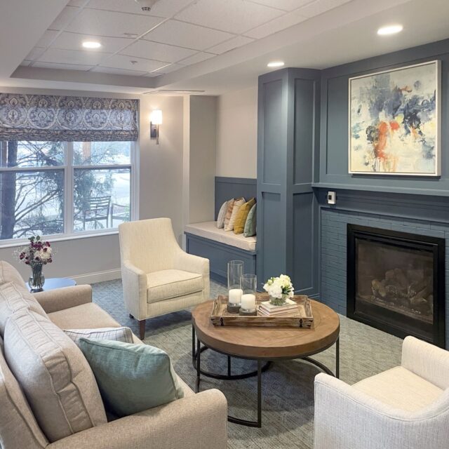 The first-floor corridors extend the light grey palette and soft tones established in earlier phases, accented by vibrant artwork that enlivens the path of travel. In the lobby, GDG redefined the experience through a series of side lounges designed to feel like welcoming residential living rooms. Custom millwork and wainscoting finished in a bold, vibrant blue bring personality and warmth to these spaces, distinguishing them from the surrounding neutrals.
